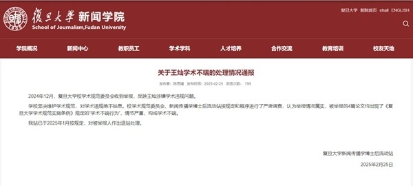 人民网北京2月25日电 (记者李依环)记者从复旦大学新闻学院获悉,近日,复旦大学校学术规范委员会收到举报,反映一名博士后研究员多次抄袭他人论文,涉嫌学术违规问题。该校新闻传播学博士后流动站今天发布通报称,举报情况属实,流动站已于2025年1月按规定,对被举报人作出退站处理。